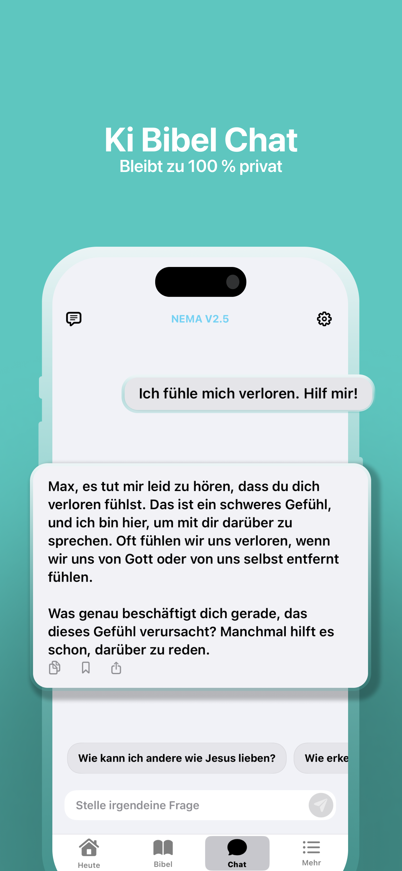 Erhalte sofortige, durchdachte Antworten auf Fragen zu Glaubensthemen, biblischen Konzepten und christlichem Leben. Unser spezialisiertes KI-Modell NemaV2.5 wurde gezielt für christliche Gespräche trainiert und versteht die feinen Nuancen glaubensbasierter Diskussionen.