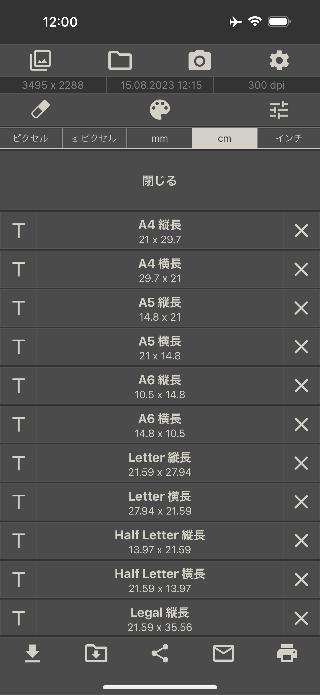 ピクセル、ミリメートル、センチメートル、インチの 4 つの単位のいずれかを使って、出力形式を指定できます。